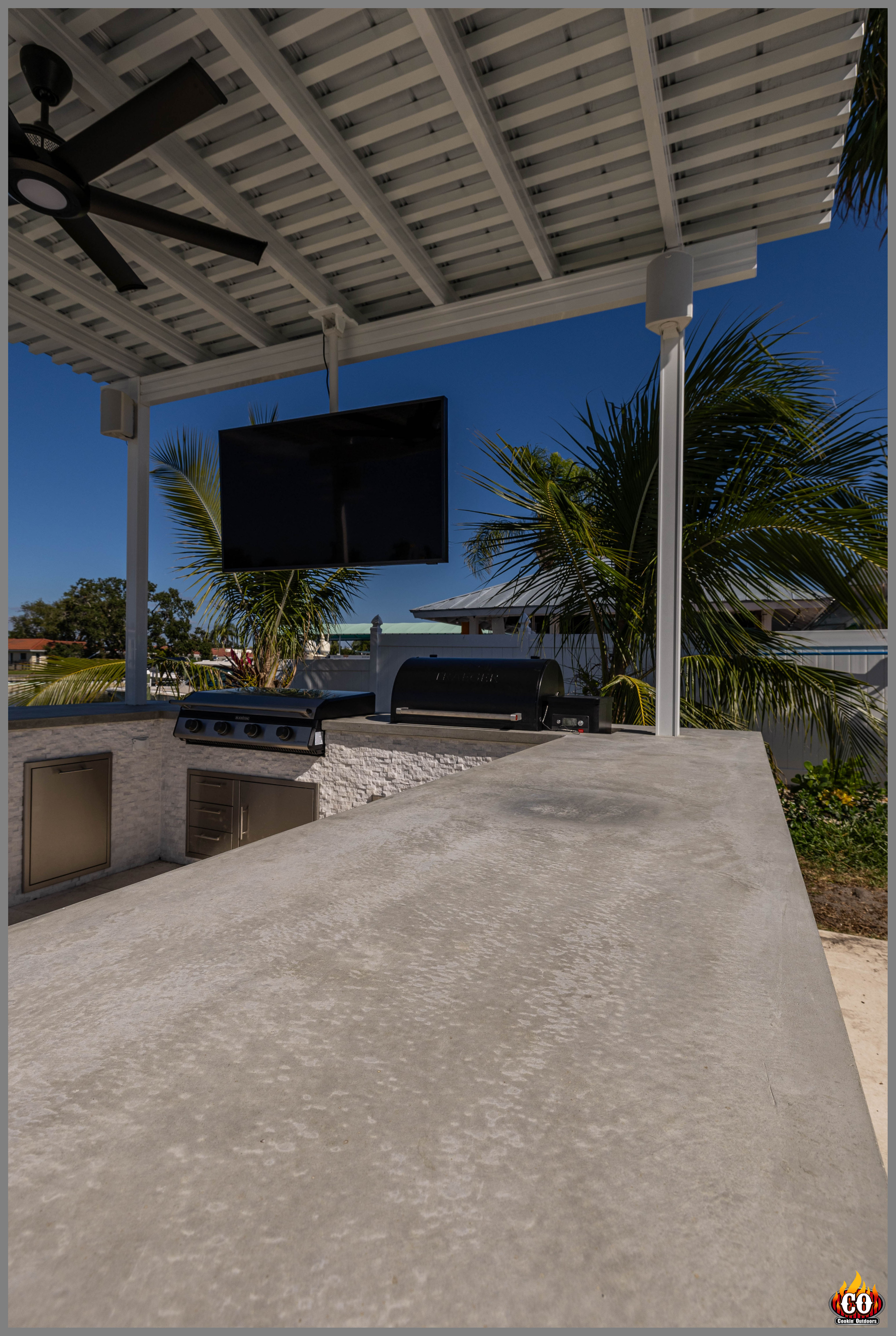 What truly elevates this project is the custom 22 linear feet of concrete outdoor kitchen cabinetry, wrapped in a premium stone veneer selected from Tile Outlets of America. The design features: