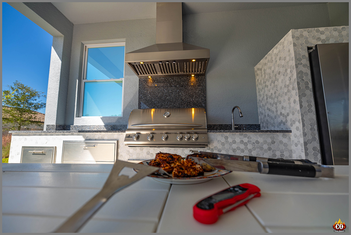 During this Florida winter season is the perfect time to add an outdoor kitchen to your back patio! This l-shaped outdoor kitchen and high bar was custom built by Cookin' Outdoors team to make our clients outdoor existing lanai more functional for their everyday needs. They can enjoy the holidays this year cooking traditional family meals on their new outdoor kitchen. The Cookin' Outdoors team will work our expert magic to create your dream outdoor kitchen and outdoor space! From outdoor kitchens to outdoor Fireplaces and firepits to pergolas, we are here to create with you! No matter the questions you have along the way we are there for you step by step! Our clients are family to us. Welcome to the Cookin' Outdoors family! We will make sure your project is to code, with our licensed contractor, Scott Taylor, behind every detail. We will provide electrical outlets for convenience and for any appliances in the outdoor kitchens, firepits, or pergolas. There is always options for upgrades, such as, pop-up outlets or or IntelliFire™ Ignition System for fireplace. This custom-built outdoor living lanai space makes this customers outdoor space feel comfortable and usable. Making an l-shaped outdoor kitchen to keep everyone fed and happy in the photographed Tampa, FL home. Cookin' Outdoors works together with each costumer until their ideas become their everyday! We are family owned and bring our love for quality concrete Florida living to you!