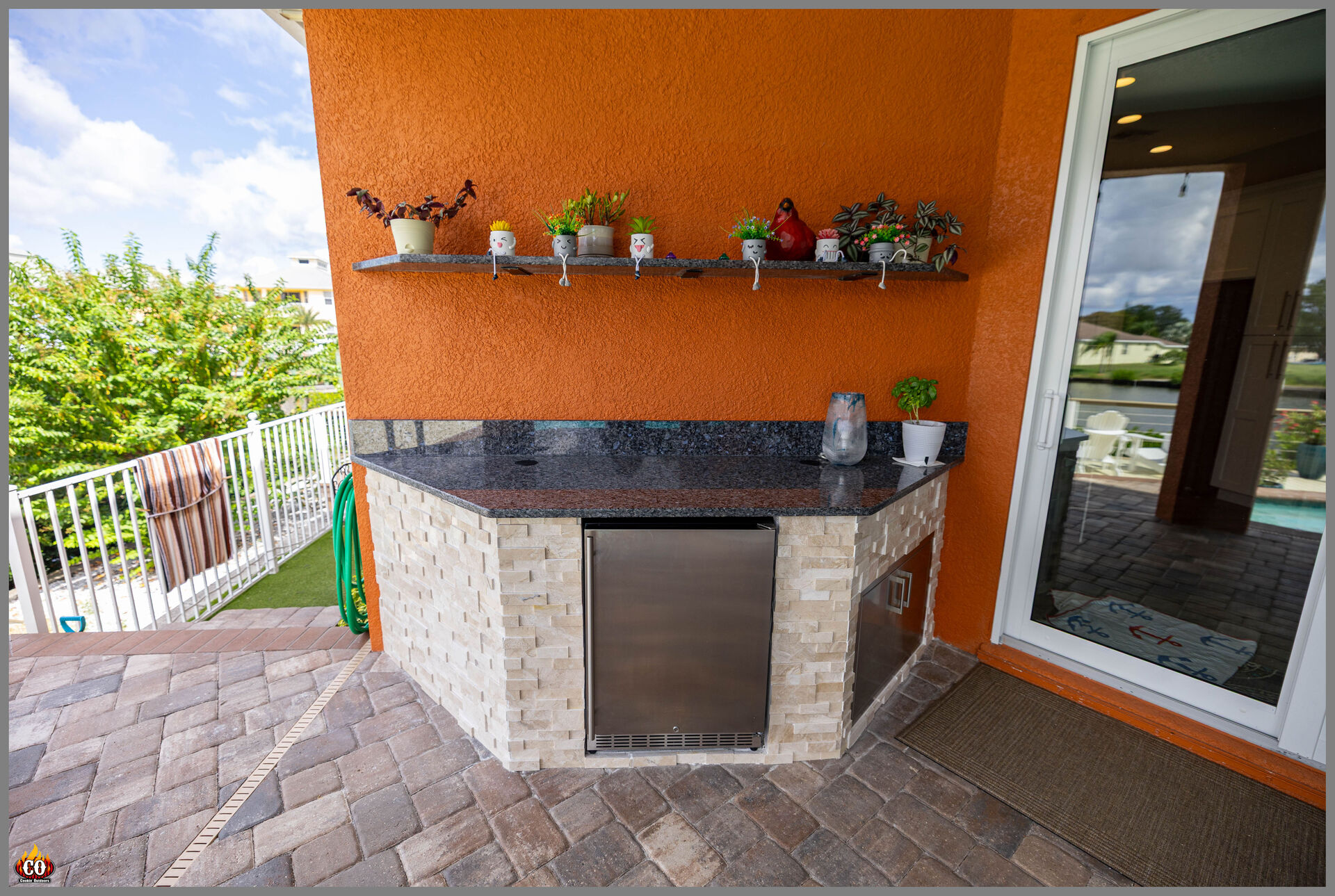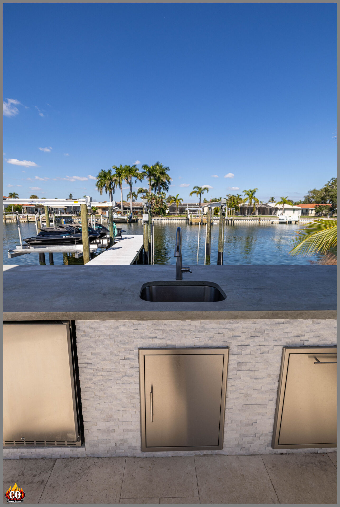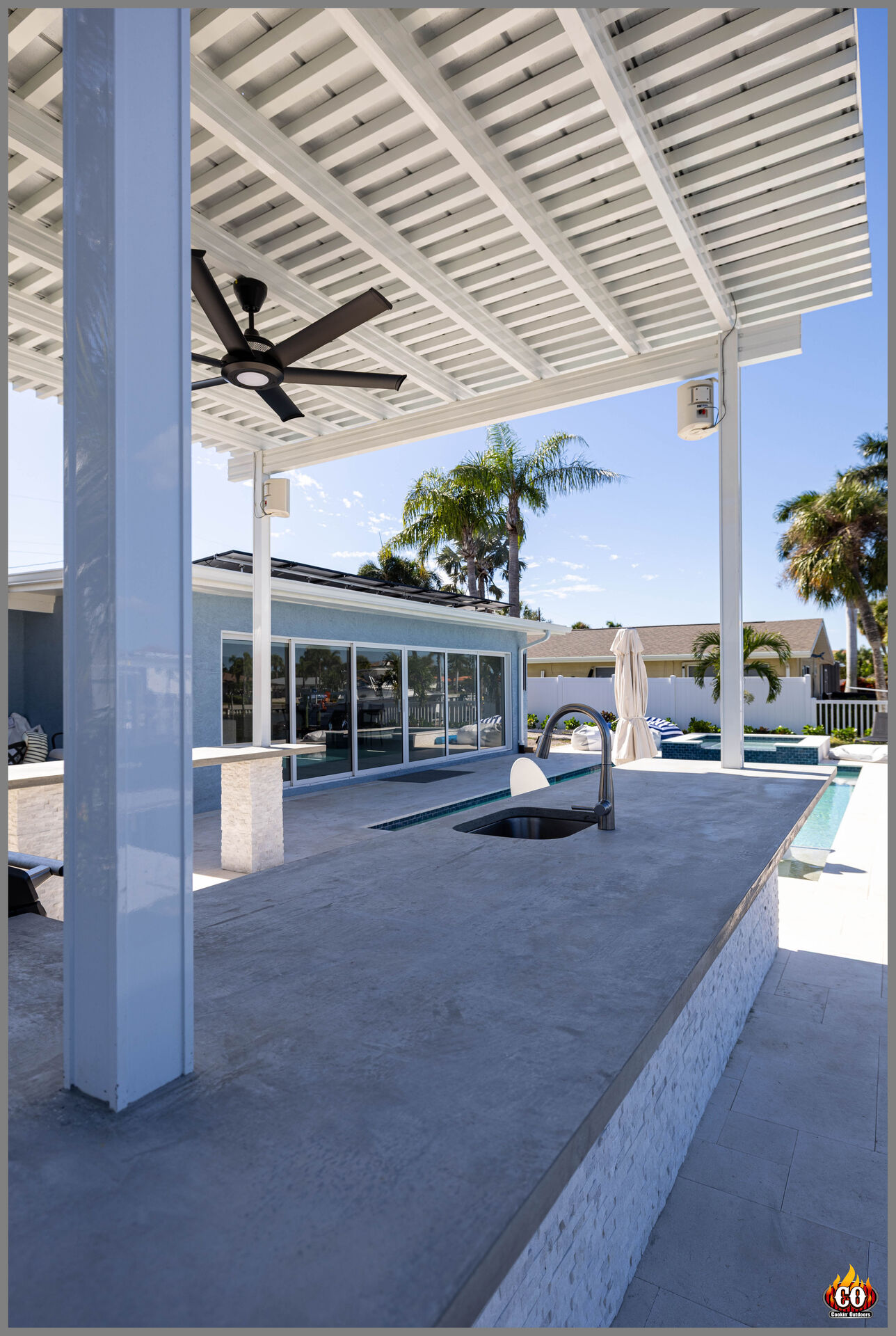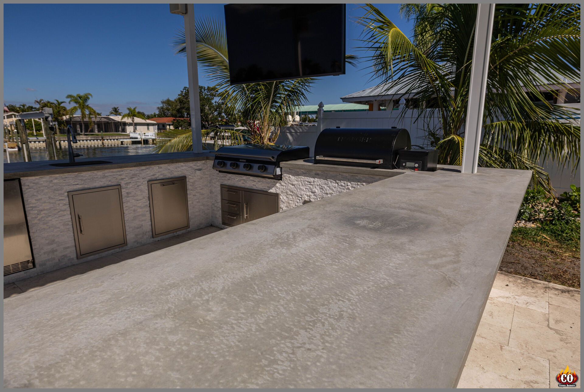 Bring your luxury living lifestly outside! Enjoy food from you grill that is custom built into a concrete constructed cabinet. Built to withstand Florida's seasons.