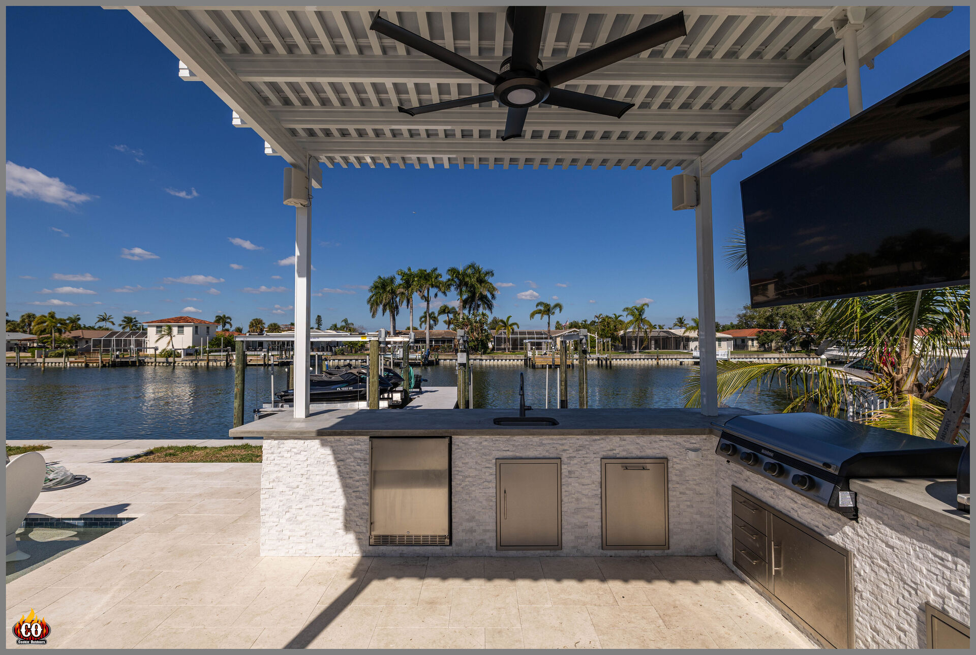 Extensive Custom Outdoor Kitchen in Tampa, FL designed and built by Cookin' Outdoors included a 15' linear outdoor kitchen, 8' fire table, 15' privacy slat wall, and 20' alunimum pergola bringing their patio to the next level.