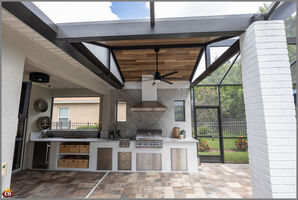 Cross-gable roof gazebo and Outdoor Kitchen custom built in St. Pete, FL designed and built by Cookin' Outdoors included a 14' linear outdoor kitchen, 18',15' custom roanforth gazebo that upgrades their patio.